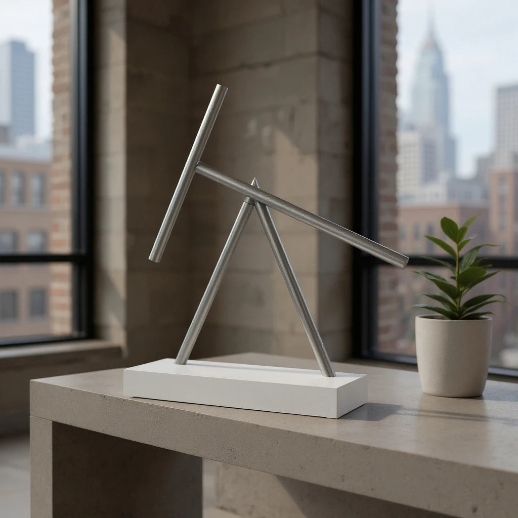 Minimalismus in Weiß & Aluminium – Die klare Formensprache und die helle, kontrastreiche Farbgebung machen diese kinetische Skulptur zu einem eleganten Highlight für moderne Interieurs, kreative Arbeitsplätze, Praxisräume und puristische Wohnräume.